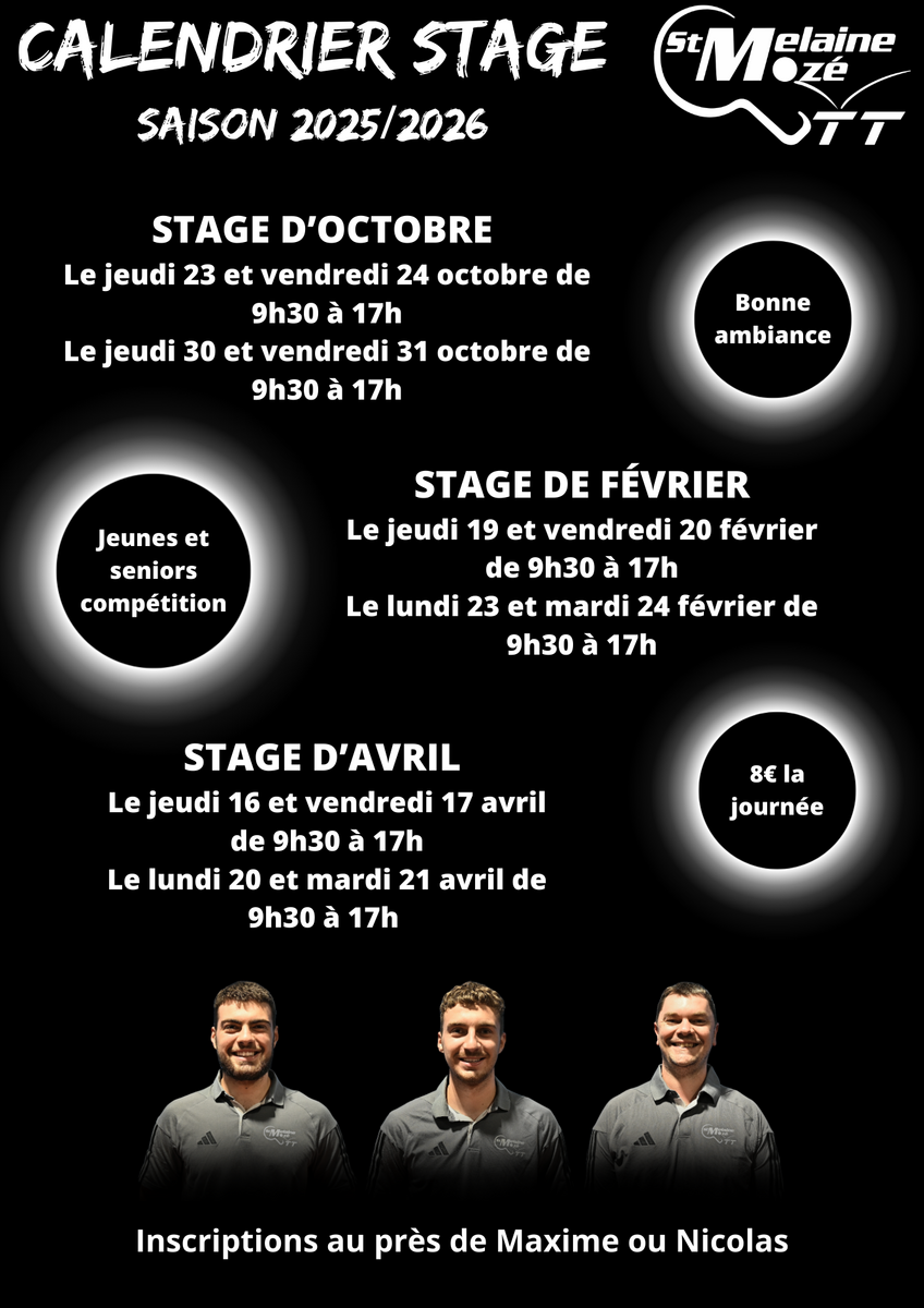Comme chaque année, notre club organise des stages pendant les vacances scolaires ! Ces moments sont l’occasion parfaite de perfectionner votre technique. 🏓